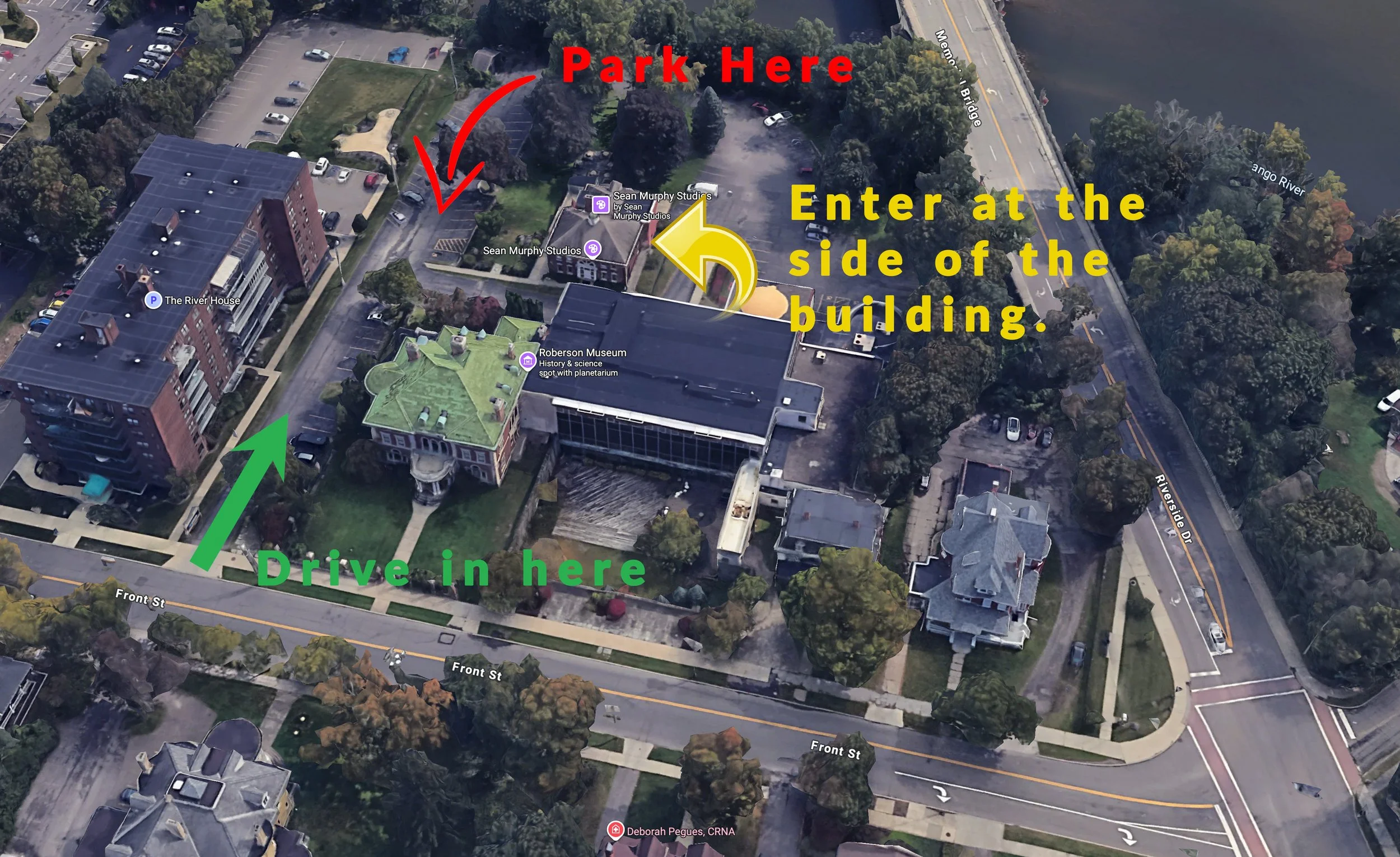We are located in the Carriage House at the Roberson Museum. The address is 34 Front Street, Binghamton NY, 13905. The photo below gives you an idea of where to park and how to get to us.